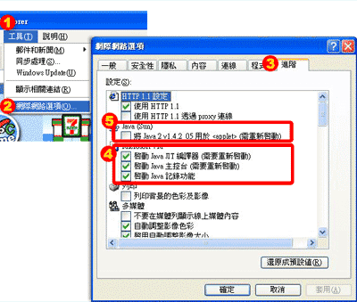 IE 視窗上的工具列的(1){工具} →(2) {網際網路選項} →(3){進階}→(4) {Microsoft VM}內三個項目均打勾。若是您另有(5){Java(Sun)}的選項,表示您可能有安裝過Sun Java 工具,請記得