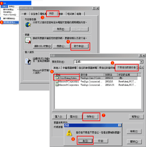 此時您需要將您目前的大廳瀏覽器視窗及遊戲網網頁的視窗關閉,然後開啟IE 視窗上的工具列的(1){工具} →(2) {網際網路選項} →(3){內容}→(4) {發行者}內 →(5){不受信任的發行者} →(6){Chun-Hsiang Internet Technology Co, Ltd.}或{Pure Circle Software Co.,Ltd.}的選項進行"移除",然後再重新開啟瀏覽器,選擇遊戲並輸入帳號密碼登入, 安全性憑證的接受詢問視窗會再重新出現,請勾選"