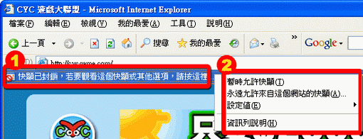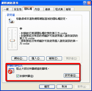 (1) 到IE視窗最上方{工具}→{網際網路選項}點選視窗上方{隱私權},下方部分會看到{快顯封鎖程式},請選"設定值"按鈕。