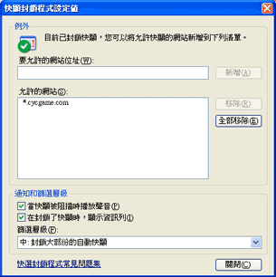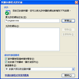 (3) 接下來您只要在"允許的網站(S)"中看到您所新增的網站位置,即表示此網站的視窗不會被攔截,您可以順利的進入遊戲大廳中了。