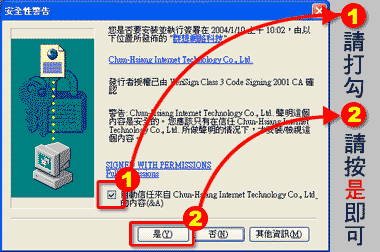 再重新開機,重新進入遊戲網中。登帳號進入遊戲,會再出現憑證的信任畫面 這時候別忘了要勾選[永遠信任]並按"是"。