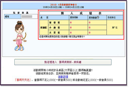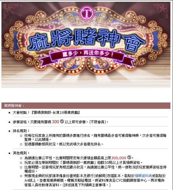 CYC網站常態性的舉辦麻將遊戲的競賽活動,每次活動週期約兩週一次,活動進行會依加值主題不同而做調整(請依活動電子報內容為主)。每位玩家只要於麻將籌碼廳內擁有300,即可進入台灣16張麻將廳參與比賽,籌碼廳活動期 間常態性舉辦『籌碼天天送』活動。