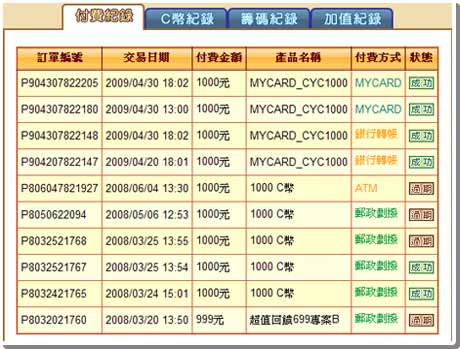 玩家購買VIP時數或C幣完成後,可在付費紀錄中查詢款項狀態。