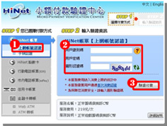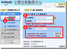 玩家請依上圖的操作順序,進入到第4步驟。請確認您的訂單資料是否正確無誤。按下「確定」後,將進入Hinet小額付款驗證中心畫面,您可選擇《上網帳號認證》或《手機認證》進行付款。