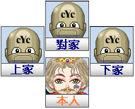 開牌時(有"開"字標示),位置反時針方向計算風位,依序為東南西北。胡牌時,有屬於自己風位的刻子。 |