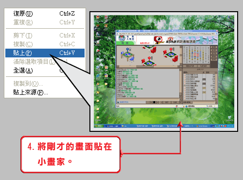 步驟四、點選「貼上」將剛才的畫面貼在檔案上。 |