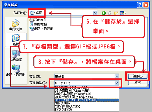 步驟六、注意!『存檔類型』最好請選擇『GIF(*.gif)』或『JPEG』圖檔。並記下你的存